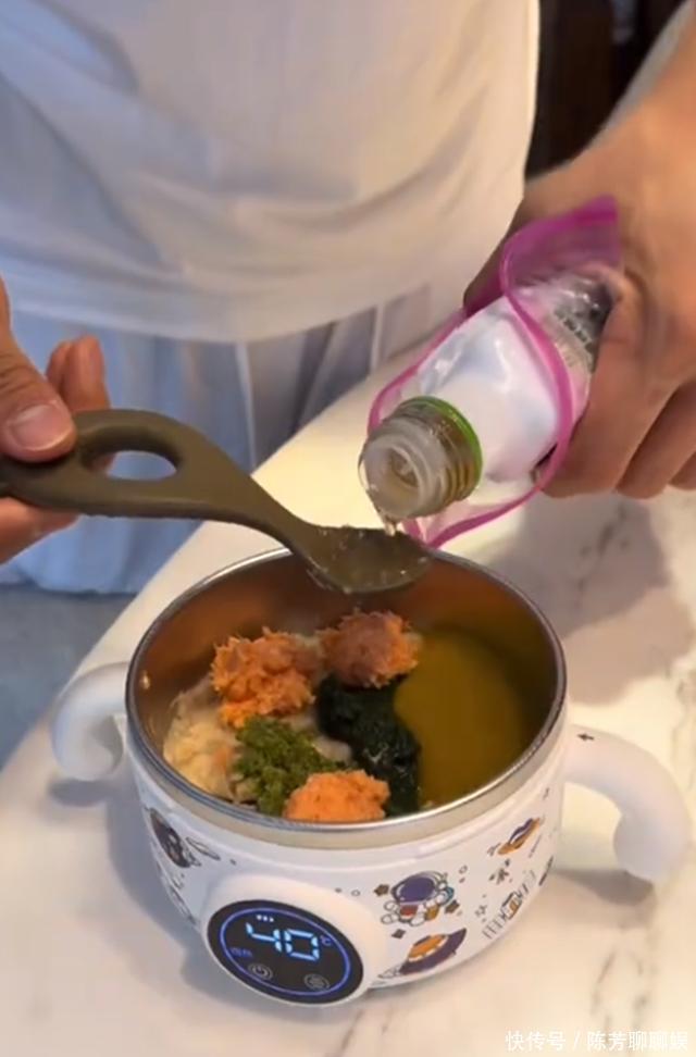 而除了上面提到的吃母乳外,Dylan也开始吃辅食,他的辅食也都是张檬小五亲自给儿子准备,从张檬晒出的Dylan辅食来看他们把菜和肉蒸熟打烂然后和米粉拌在一起,给儿子吃得很有营养。